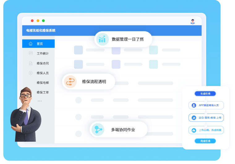 维保人员通过手机app即可完成全部操作,告别纸质工单,数据实时同步。